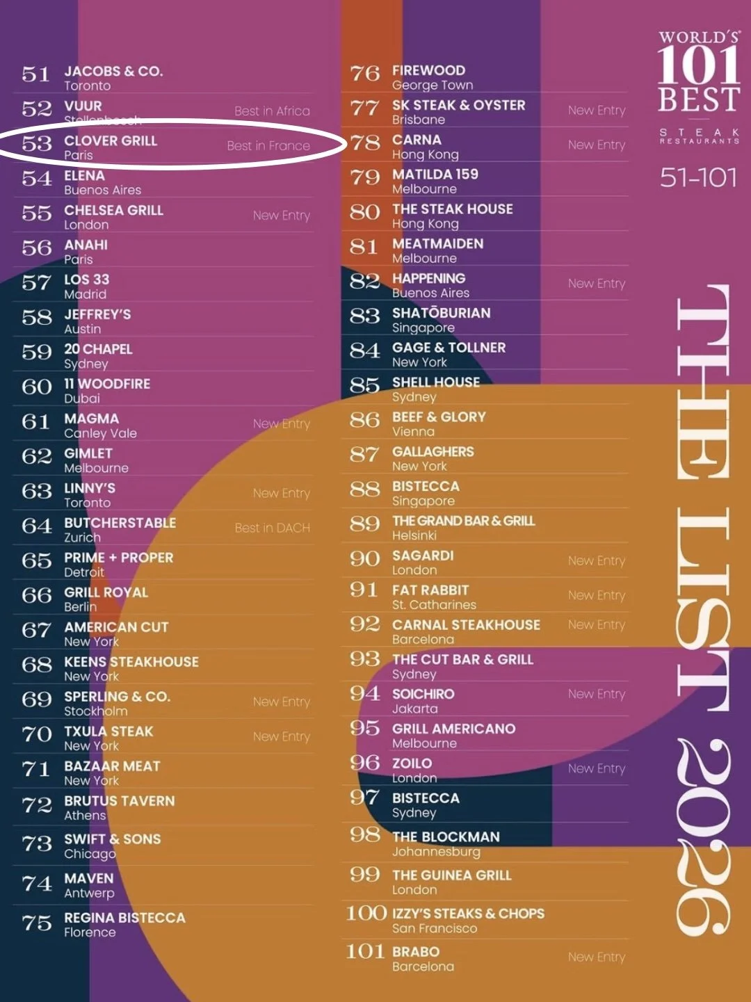 Classé numéro 1 des steakhouses de France, le Clover Grill a décroché la 53ᵉ place au classement des meilleurs steakhouses du monde.